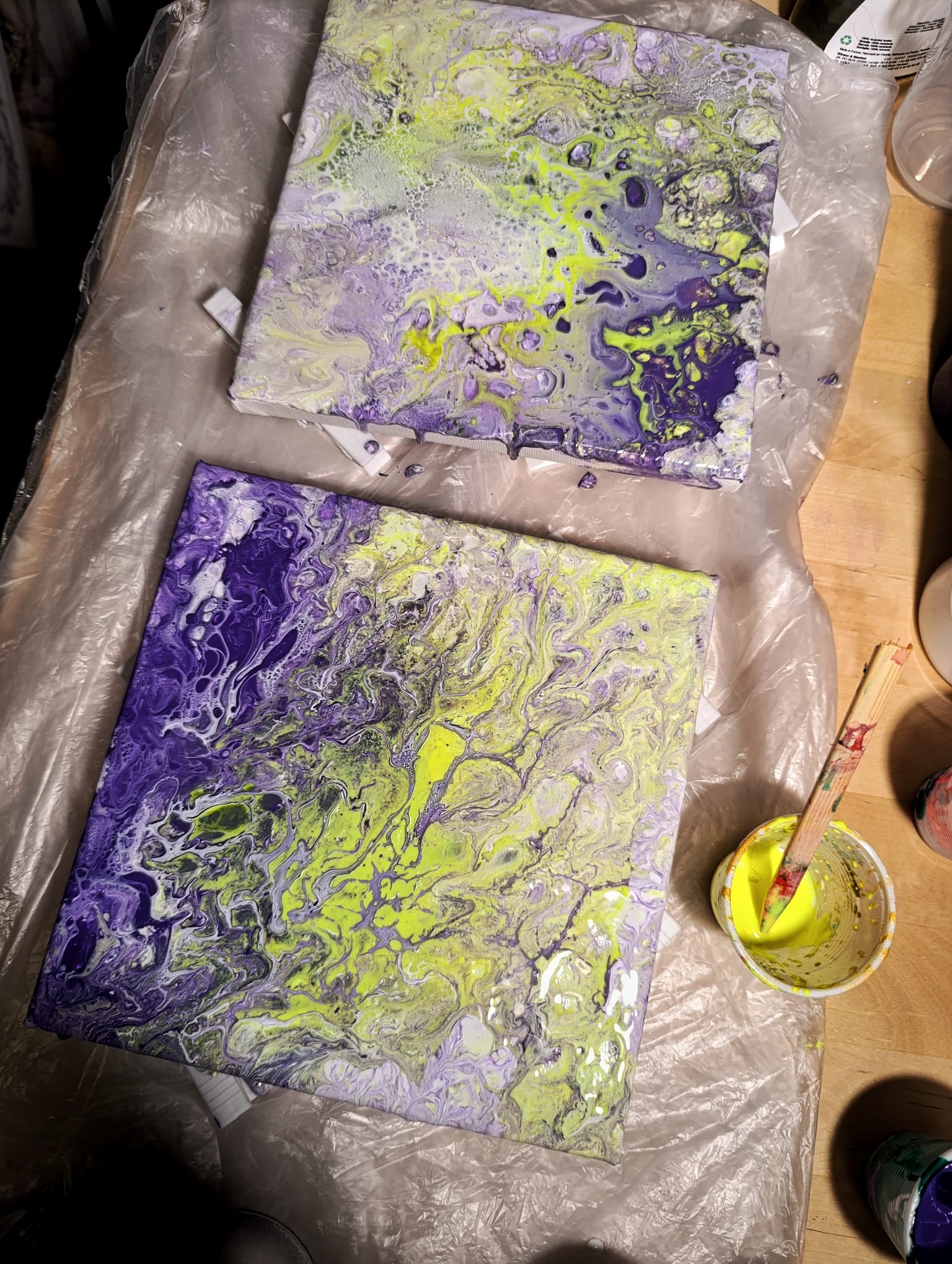 Comunque la tecnica è quella dell’acrylic pouring. L’ho visto in un video di Fraffrog. Praticamente prendi dei colori acrilici, li mescoli con colla vinilica e sapone (ci sono anche varianti più professionali che però non mi andava di comprare) e li versi a casaccio su una tela per creare degli effetti marmorei o simil acquatici. Sono abbastanza “malleabili”, cioè siccome ne usi una gran quantità e sono viscosi e non si asciugano subito, li puoi muovere inclinando la tela, o direttamente soffiandoci sopra. Tutto è fluido, ma i colori non si mischiano perdendo la loro identità o saturazione, e restano più o meno uguali. Inoltre per via del sapone si repellono e creano delle bollicine molto estetiche. È un processo veramente rilassante, quasi spirituale. Avrei dovuto farlo prima. Non ho hobby, solitamente o studicchio o sto nel letto, ma questo mi ha conquistato.