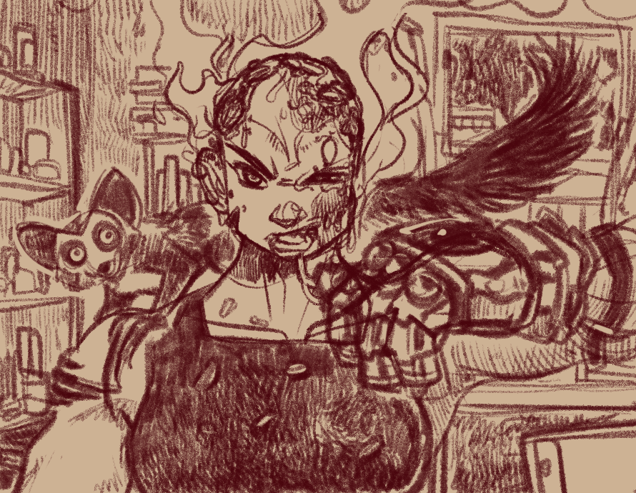 Anch’esso si mosse saettando, avviluppandosi a mo’ di sciarpa sulla testa della strega muscolosa. Il legno del tavolo tornò solido regalando a Melanippe una brutta sensazione di compressione e di dolore. Un urlo soffocato di rabbia fece accendere i guanti con quello strano bagliore giallo limone, afferrò una delle gambe del tavolo che si era attorcigliato a spirale e questo divenne nero, sgretolandosi poi in cenere bianca e lapilli incandescenti, fiamme arancioni cominciavano ad espandersi. Si tornò a vedere la bocca della strega che prendeva rumorosamente aria, il resto del tavolo prese fuoco direttamente sulla testa, conferendo alla gigantessa una nuova capigliatura punk fiammeggiante, Otto si era riparato attaccandosi alla cintura.