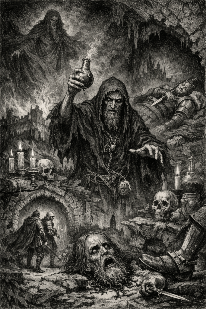 Nella sua cella segreta, sotto cumuli di macerie, s’ingegnava di nascosto, tra pozioni e pergamene, uno stregone.