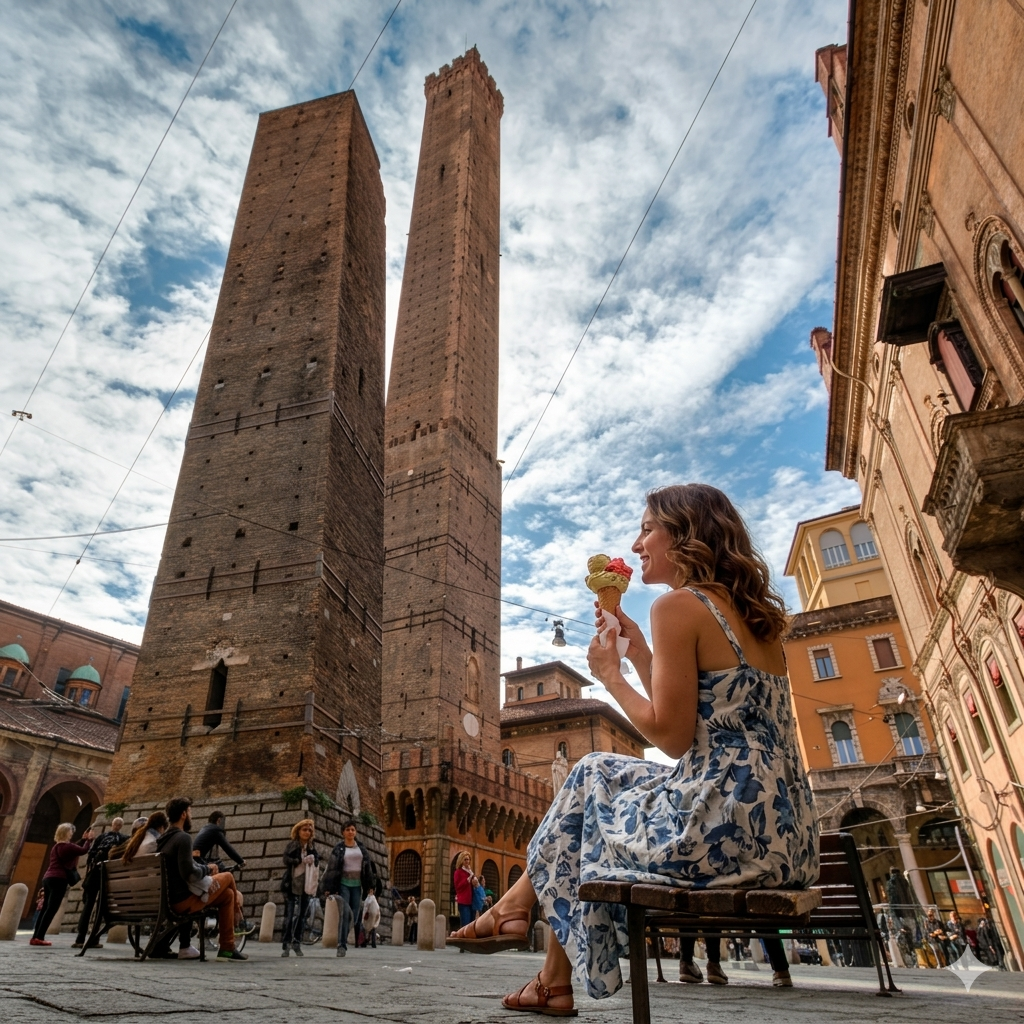 Erano da poco passate le 17:00 e Giada pensò di andare in centro per fare quattro passi e prendere un cono gelato. Si sedette su una delle panchine di fronte alle Due Torri.