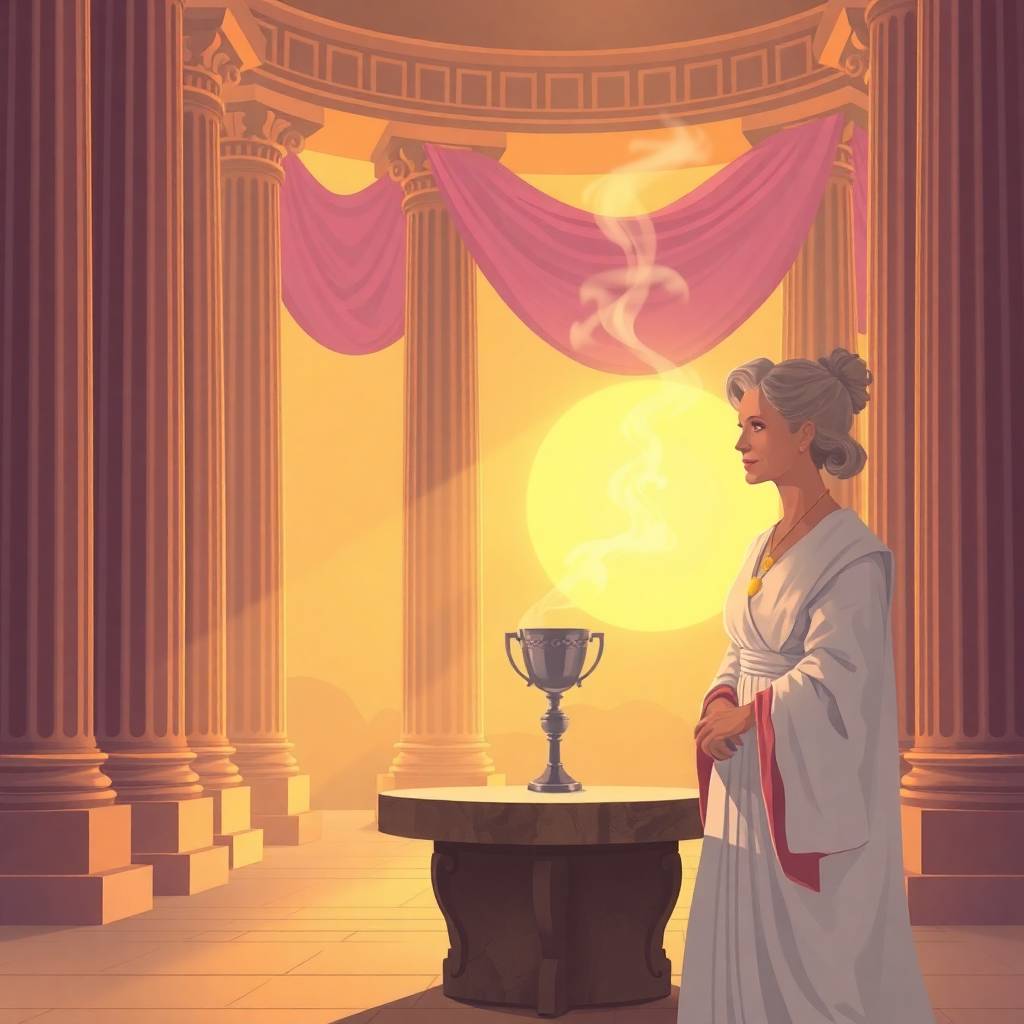 Il tempio si ergeva integro intorno a me. Il marmo bianco rifletteva una luce dorata. Colonne altissime, drappi di porpora, il fumo denso dell’incenso. Al centro, dietro un velo, una figura respirava piano, come immersa in un sogno.