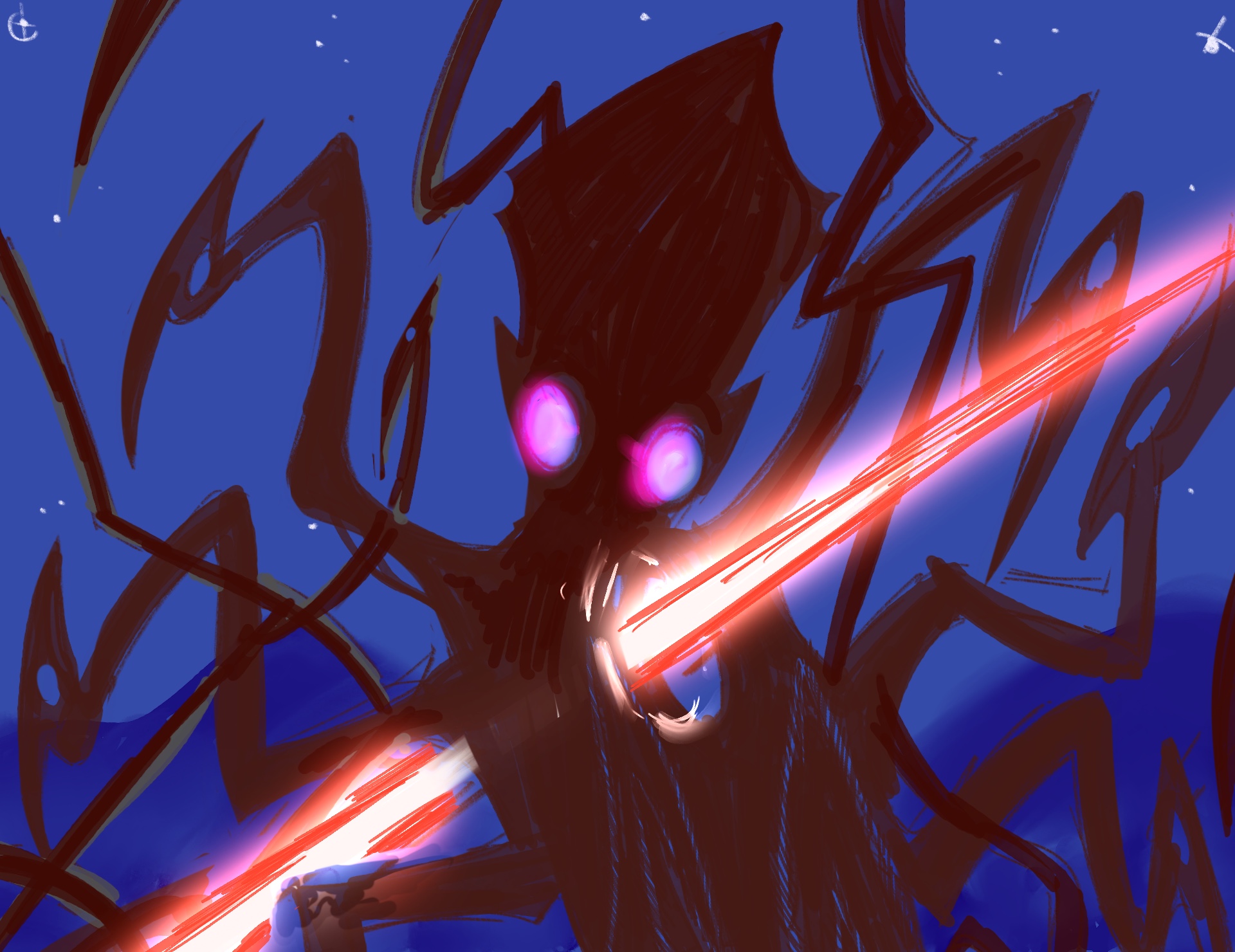 Il fascio di luce illuminò l’intera area e creò un foro perfettamente circolare nel torace di quel polpo tentacolato, colpì anche il suolo sottostante, formando una profonda striscia rossastra di terreno dissolto dal calore del laser, nel buio di quella nottata stellata un secondo flash luminoso rischiarò a giorno per un breve istante tutta la zona. La creatura fatta d’ombra si ritrovò senza una parte dei suoi tentacoli, polverizzati da quel potente raggio, aveva gli occhi sgranati, grandi quanto due piattini da sotto tazzina per il caffè.