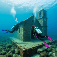 L’antica chiesa, eretta sul mare, era tornata ad essere abbracciata dalla vita sottomarina. La scogliera, le alghe e tutta la vita acquatica sembrava l’avessero accolta…